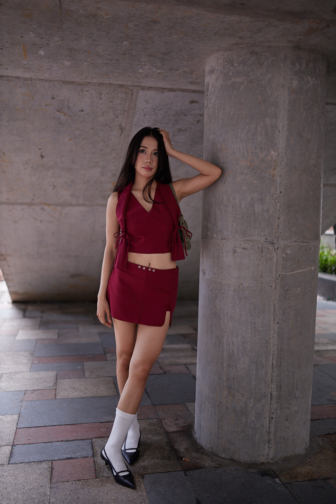 Áo croptop không tay màu đỏ rượu vang, cổ vest cách điệu khoét chữ V thanh lịch. Dây buộc hai bên hông tạo nếp xếp nữ tính. Khóa kéo kim loại sau lưng hiện đại, dễ mặc giúp tháo và giữ form tốt.