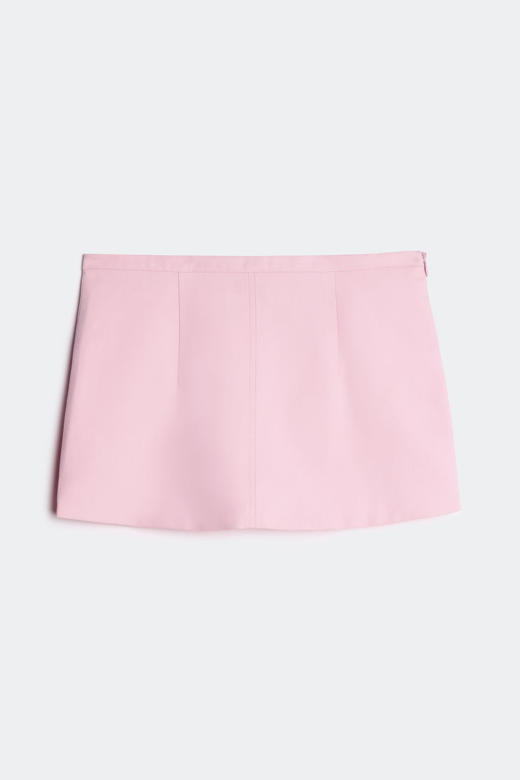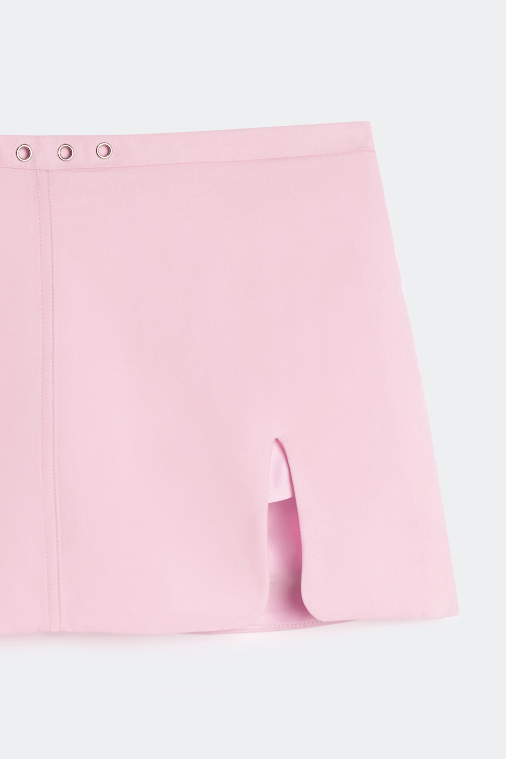 Chân váy chữ A màu hồng phấn, cạp trễ đính khuyên kim loại tinh xảo, xẻ tà lệch nhỏ tạo điểm nhấn. Khóa kéo bên hông hiện đại, dễ mặc.