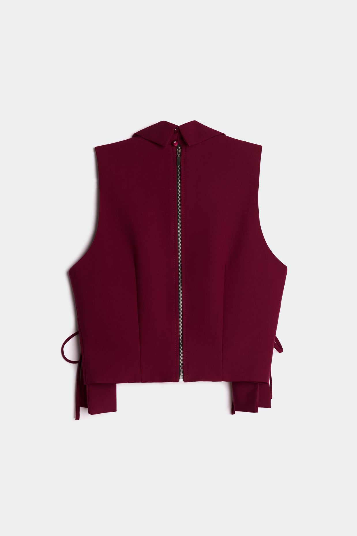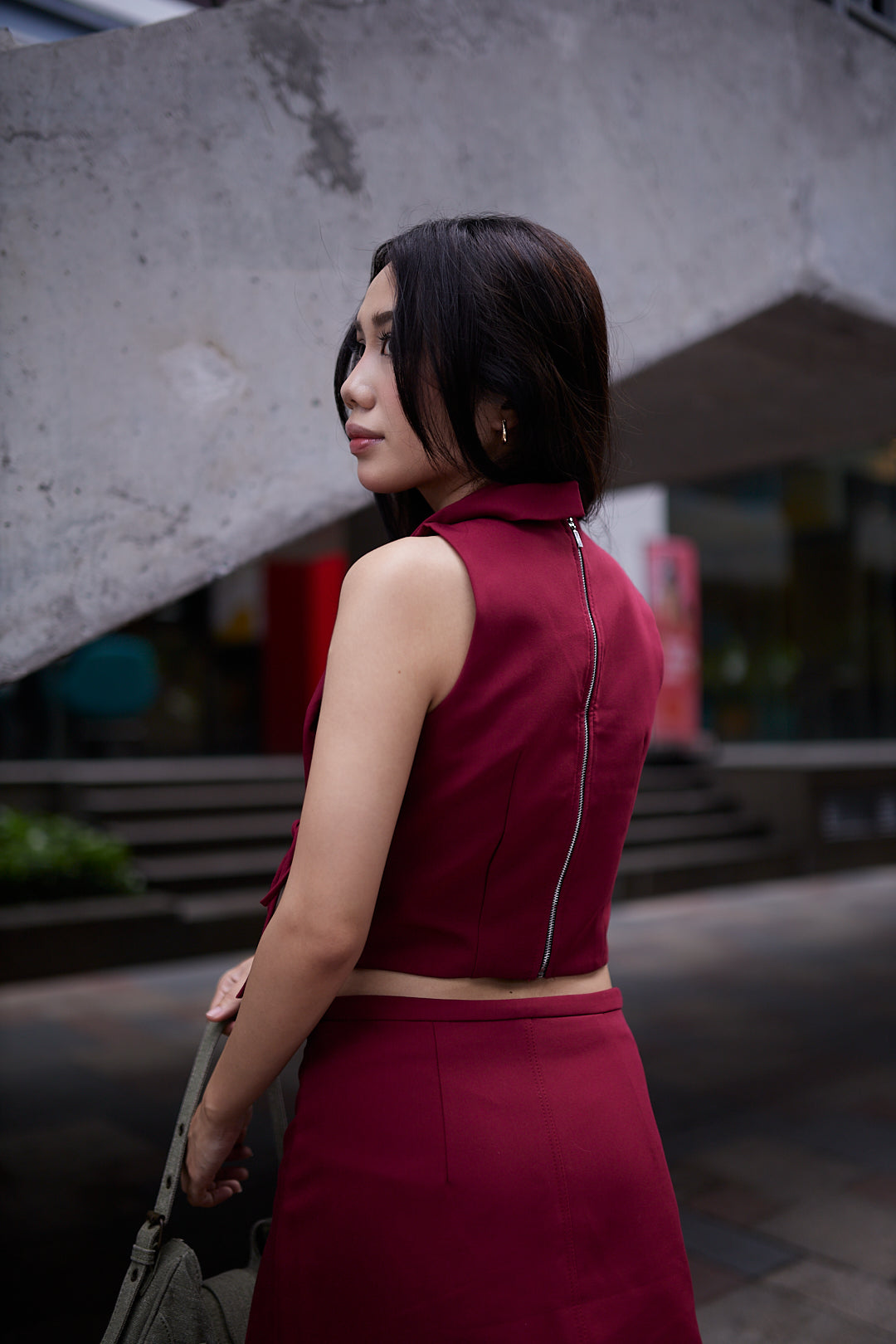 Áo croptop không tay màu đỏ rượu vang, cổ vest cách điệu khoét chữ V thanh lịch. Dây buộc hai bên hông tạo nếp xếp nữ tính. Khóa kéo kim loại sau lưng hiện đại, dễ mặc giúp tháo và giữ form tốt.
