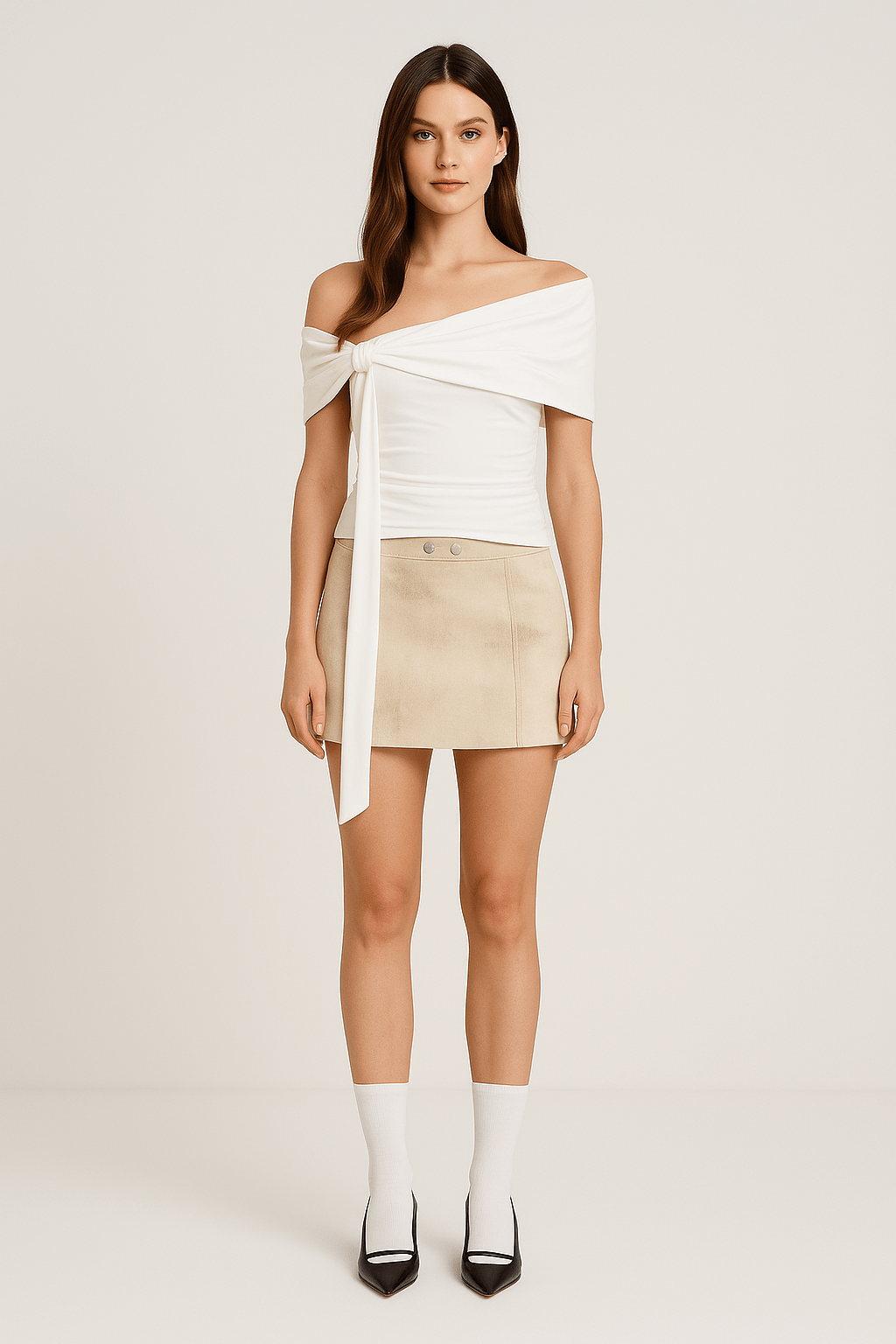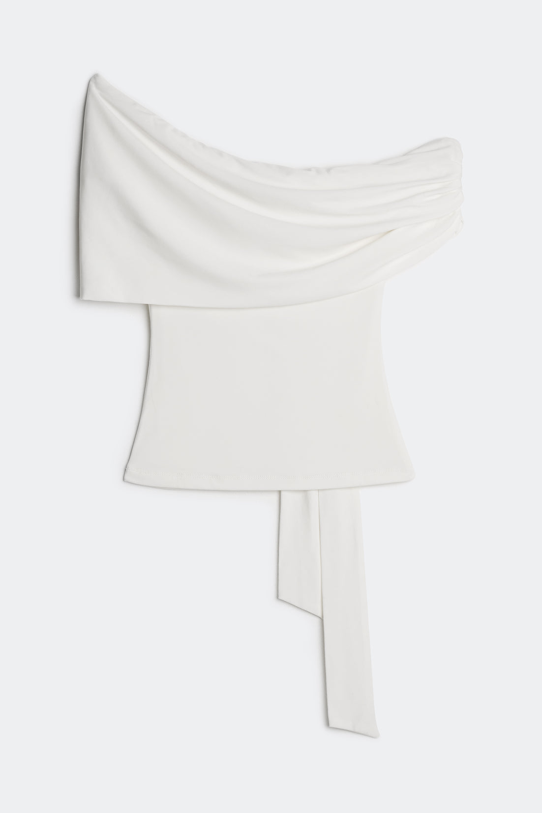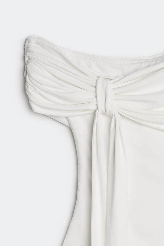 Áo lệch vai màu trắng ngà. Phần thân trên túm nếp và thắt nút lệch trước tạo điểm nhấn sang trọng, ôm vừa vặn.